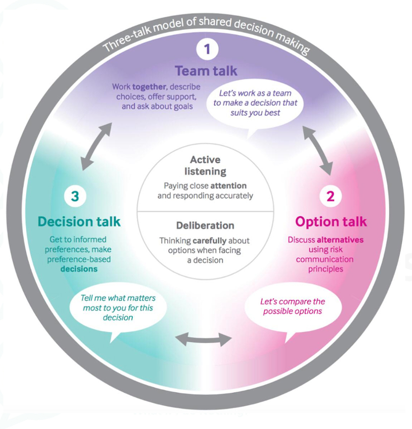 Shared decision-making, whereby patients and clinicians collaborate to make the best evidence-based decision within the context of the patients’ values, is recognised as a vital component of perioperative care. The benefits of shared decision-making are accepted by NICE and the Centre for Perioperative Care (CPOC), yet evidence suggests we may not be doing it as well as we should. A recent CPOC survey showed that 39% of patients desired more support or information regarding treatment choices. In another study, 14% of patients expressed regret, and said that they would not have had surgery had they understood the risks and alternatives. View the ‘three-talk’ model of shared decision-making suggested by CPOC.
